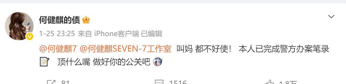 1月25日深夜,举报账号的当事人就发声,顶什么嘴,做好你的公关吧,疑似手上掌握了重大证据,根本不怕何健麒报 警。