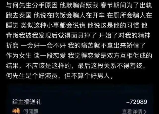 “榜一大姐”对何健麒的评价是:何先生是一个好演员,但不算一个好男人。