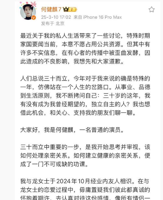 3月10日,何健麒终于发声,承认两人恋人关系,他也是真诚地和对方交往,却没有承认有两人之间有经济纠纷。