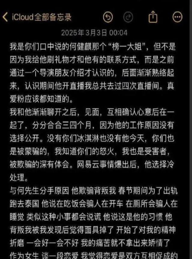 她称和何健麒分手的原因,是因为对方欺骗背叛,春国期间跑去泰国出 轨,而且从他嘴里听不到什么真话,而何说这是他的习惯。